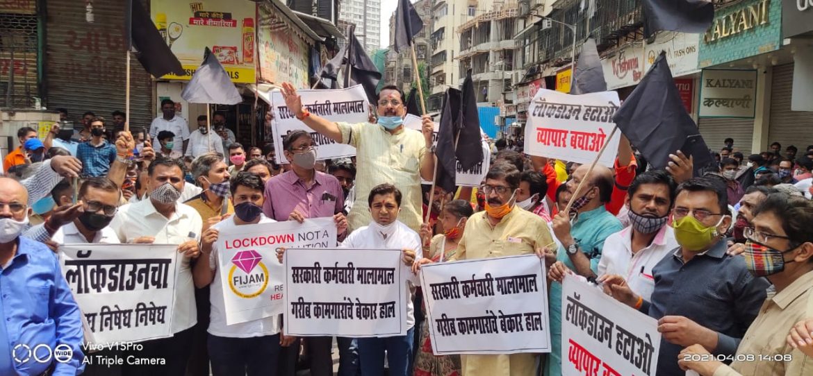 गुरूवार को दोपहर 1 बजे महाराष्ट्र सरकार द्वारा जारी किये गए व्यापार विरोधी “पोलिटिकल लॉकडाउन” का सभी प्रमुख व्यापारिक संस्थाओं व संगठनों द्वारा निषेध व्यक्त किया गया। मुंबई के सबसे बड़े व्यापारी क्षेत्र कालबादेवी, भुलेश्वर, झवेरी बाजार, दागिना बाजार के सभी छोटे – बड़े व्यापारियों ने अपनी अपनी दूकान के आगे खड़े रहकर, मुँह और हाथ पर काली पट्टी बांधकर निषेध व्यक्त किया। व्यापार हितैषी व व्यापारी मित्र एवं महाराष्ट्र के पूर्व कैबिनेट मंत्री राज के. पुरोहित ने व्यापारियों के इस शांतिपूर्ण आंदोलन में सहभागी होकर व्यापारियों का समर्थन किया। राज पुरोहित ने इस आंदोलन के माध्यम से महाराष्ट्र की तमाम जनता और व्यापारी वर्ग की और से महाराष्ट्र सरकार से मांग की है की सरकार सुबह ८ बजे से शाम ६ बजे तक व्यापार करने की अनुमति देवे तांकि शाम ८ बजे तक सभी अपने अपने घर पर सुरक्षित पहुंचे। साथ ही साथ किरायेदार व्यापारी को लॉकडाउन में आर्थिक परिस्थिति कमजोर होने के कारण समयपर किराया नहीं दे सके, उन्हें राहत दिलाने में सरकार सहयोग करे। लॉकडाउन में बिजली के भारी बिल में राहत दिलाने में सहयोग करे, अन्यथा बिजली का बिल माफ़ करने का प्रावधान करे।
