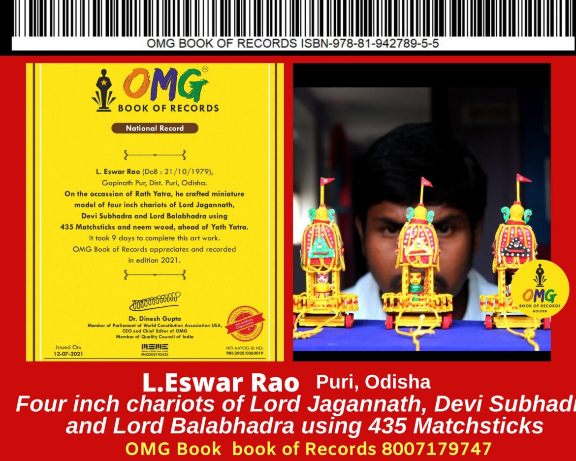 गोपीनाथ पुर, पुरी, उड़ीसा के एल ईश्वर राव ने अपनी आस्था और कला से रथ यात्रा उत्सव के दिन 435 माचिस और नीम की लकड़ी का उपयोग कर भगवान जगन्नाथ, देवी सुभद्रा और भगवान बलभद्र के चार इंच का रथ की आकृति बनाकर सबको चौंका दिया है. इस रथ में तीनों की एक इंच की आकृति भी बैठायी गयी है. इसे दुनिया की सबसे छोटी क्रिएटिविटी का दर्जा दिया गया है. इसे तैयार करने में उन्हें 9 दिन का समय लगा। उनके इस कला को विशेष रुप से ओ एम जी बुक ऑफ रिकॉर्ड्स में शामिल किया गया है.