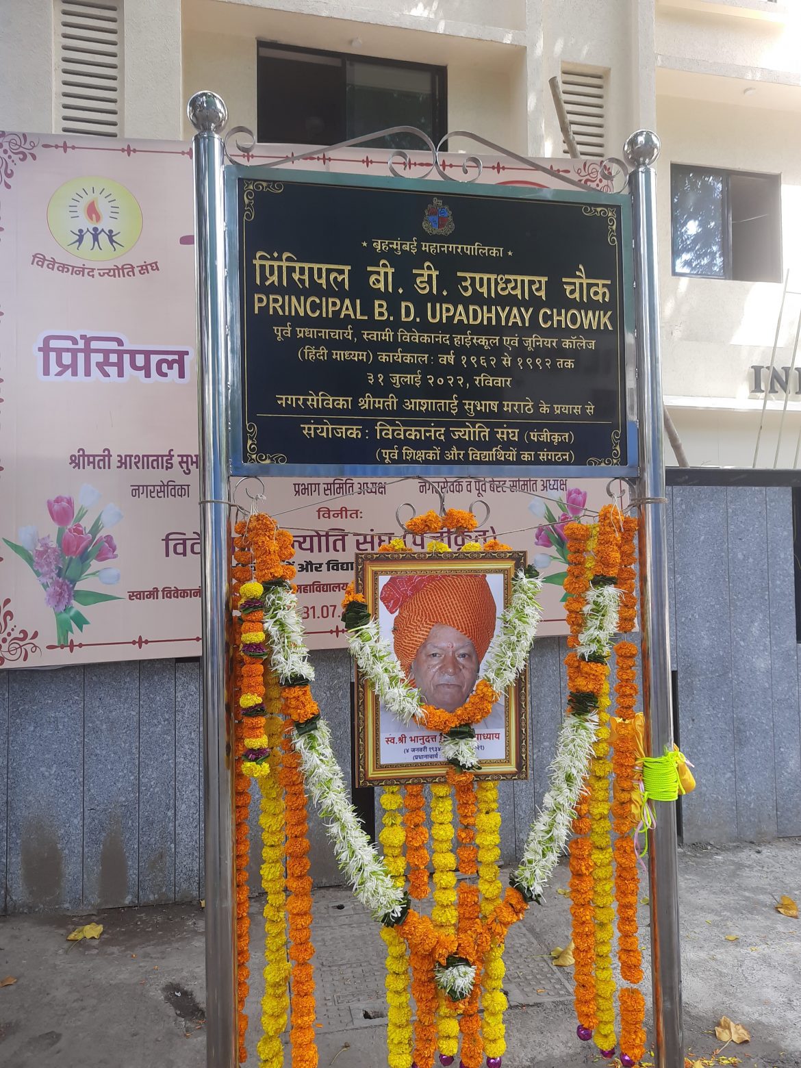 मुंबई: रविवार को सिंधी सोसायटी, चेंबूर में स्वामी विवेकानंद हाईस्कूल एवं जूनियर काॅलेज (हिंदी माध्यम) के पूर्व प्रधानाचार्य स्वर्गीय बी.डी.उपाध्याय के नाम पर एक चौक का नामकरण किया गया। चौक का अनावरण वार्ड क्रमांक 152 की पूर्व नगरसेविका आशाताई सुभाष मराठे ने किया । अब यह चौक ‘प्रिंसिपल बी.डी.उपाध्याय चौक’ के नाम से जाना जाएगा।