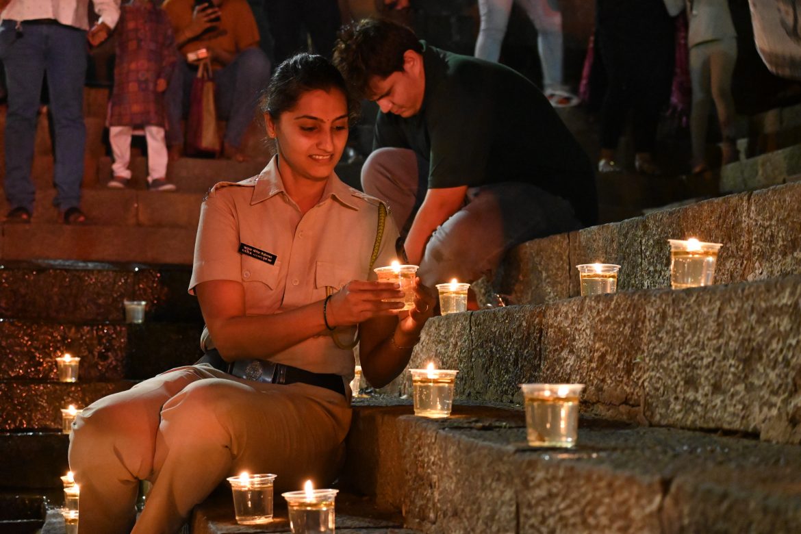 श्रद्धा और कर्तव्य का संगम:त्रिपुरारी पूर्णिमा के अवसर पर बाणगंगा में दीप पूजन किया गया. इस अवसर पर अपनी ड्यूटी की व्यस्तता से समय निकाल कर बाणगंगा की घाट पर दीप प्रज्वलित करती हुई पुलिसकर्मी : फोटोः मनीष गुप्ता