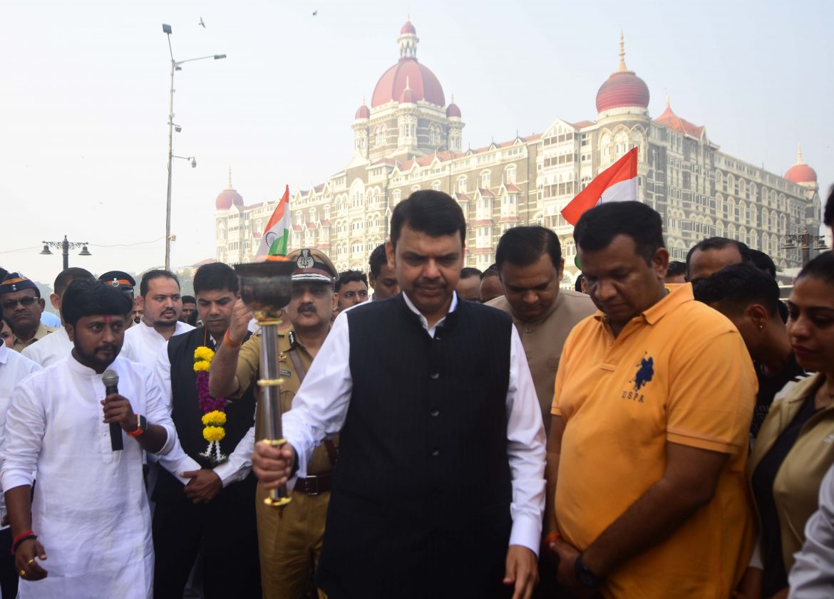 महाराष्ट्र पुलिस बॉयज असोसिएशन ने मुंबई पर हुए आतंकी हमले की चौदहवीं वर्षगांठ पर गेटवे ऑफ इंडिया पर शनिवार को श्रद्धांजलि कार्यक्रम का आयोजन किया गया. इस अवसर पर उप मुख्यमंत्री देवेंद्र फडणवीस और मुंबई पुलिस आयुक्त विवेक फणसळकर और छात्रों ने श्रद्धांजलि दी. फोटो:मनीष गुप्ता