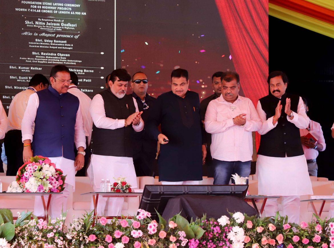 शुक्रवार को केंद्रीय मंत्री नितिन गडकरी ने मुंबई गोवा हाईवे के गड्ढे वाले 64 किलोमीटर रोड पलस्पे से इंदापुर कंक्रिटिकरन का भूमिपूजन किया. इस दौरान पालकमंत्री उदय सामंत, मंत्री रविंद्र चव्हाण, सांसद श्रीरंग बारणे आदि उपस्थित थे.फोटो मनीष गुप्ता