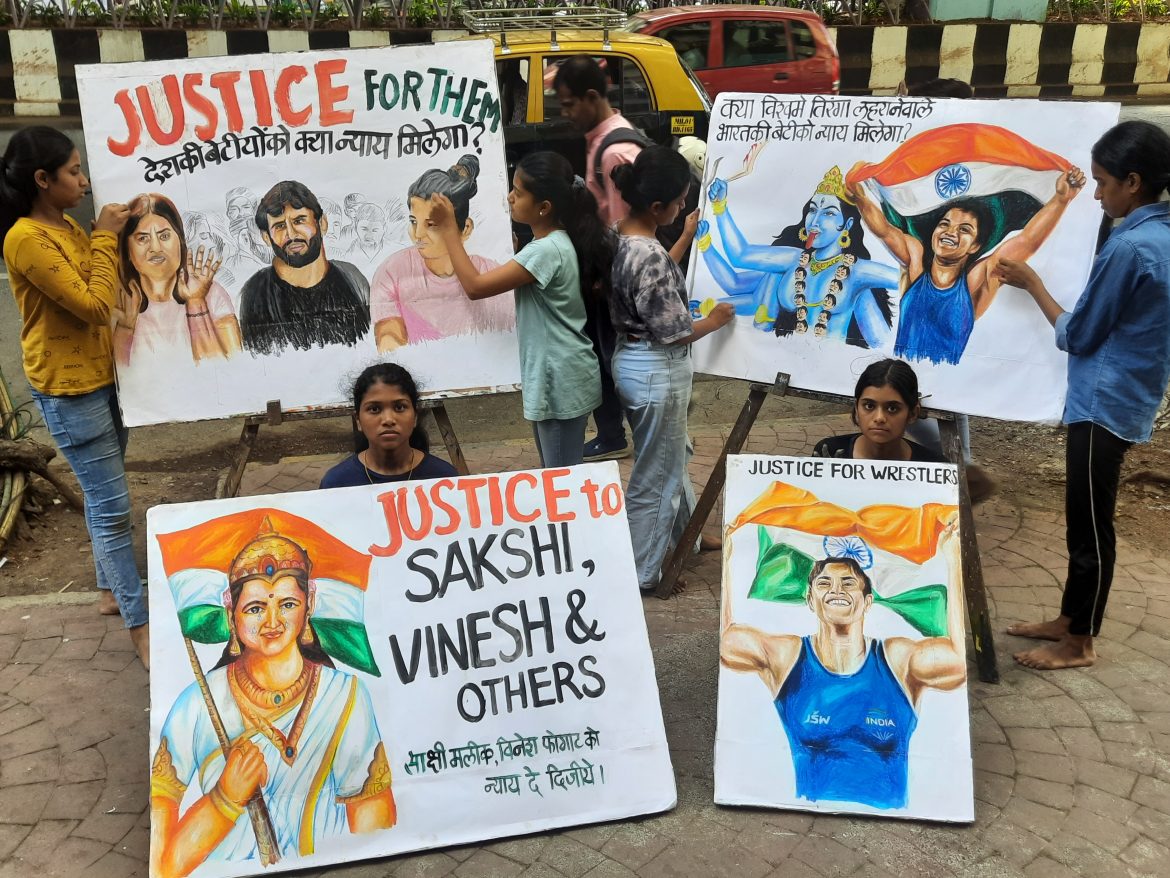 मुंबई(निर्भय पथिक):गुरुकुल ,मुंबई के छात्रों ने रंग चित्र बनाकर भारत के कुश्तीबाजों की मांगों के समर्थन में कला प्रदर्शनी लगाई. चित्र में पोस्टरों के साथ रंगकर्मी छात्र. .