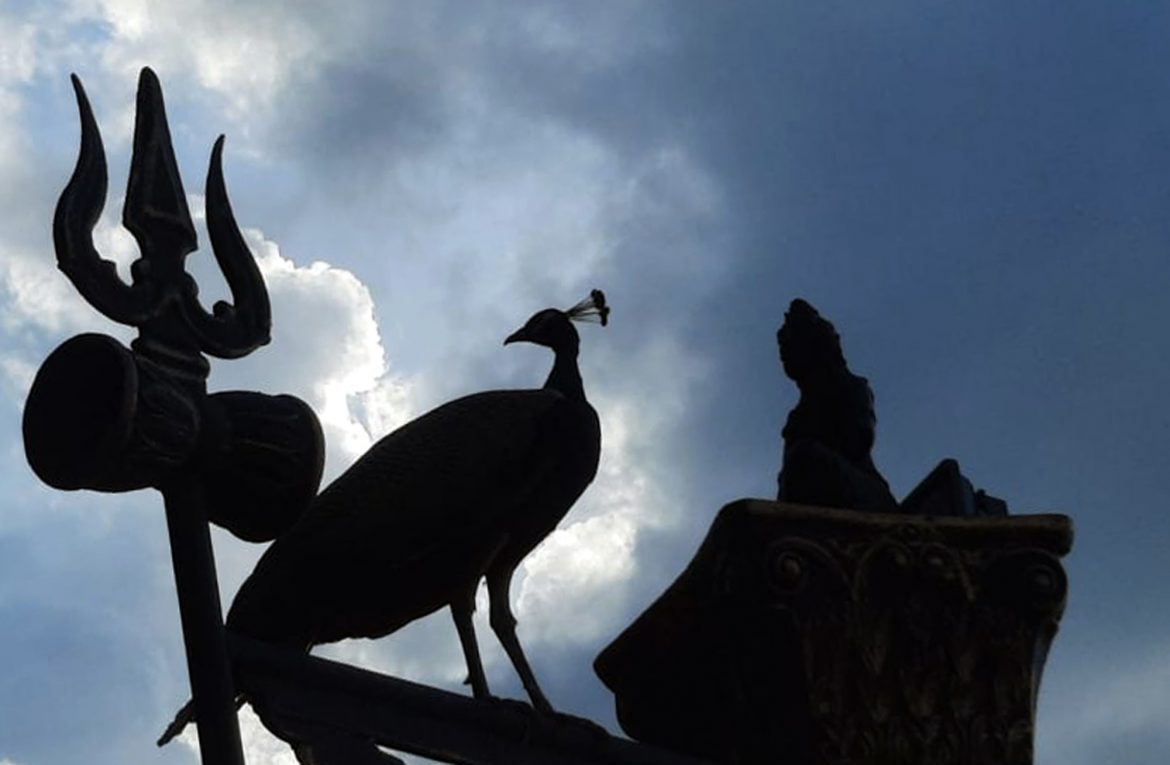 भगवान शिव के त्रिशूल के संग बैठा मोर